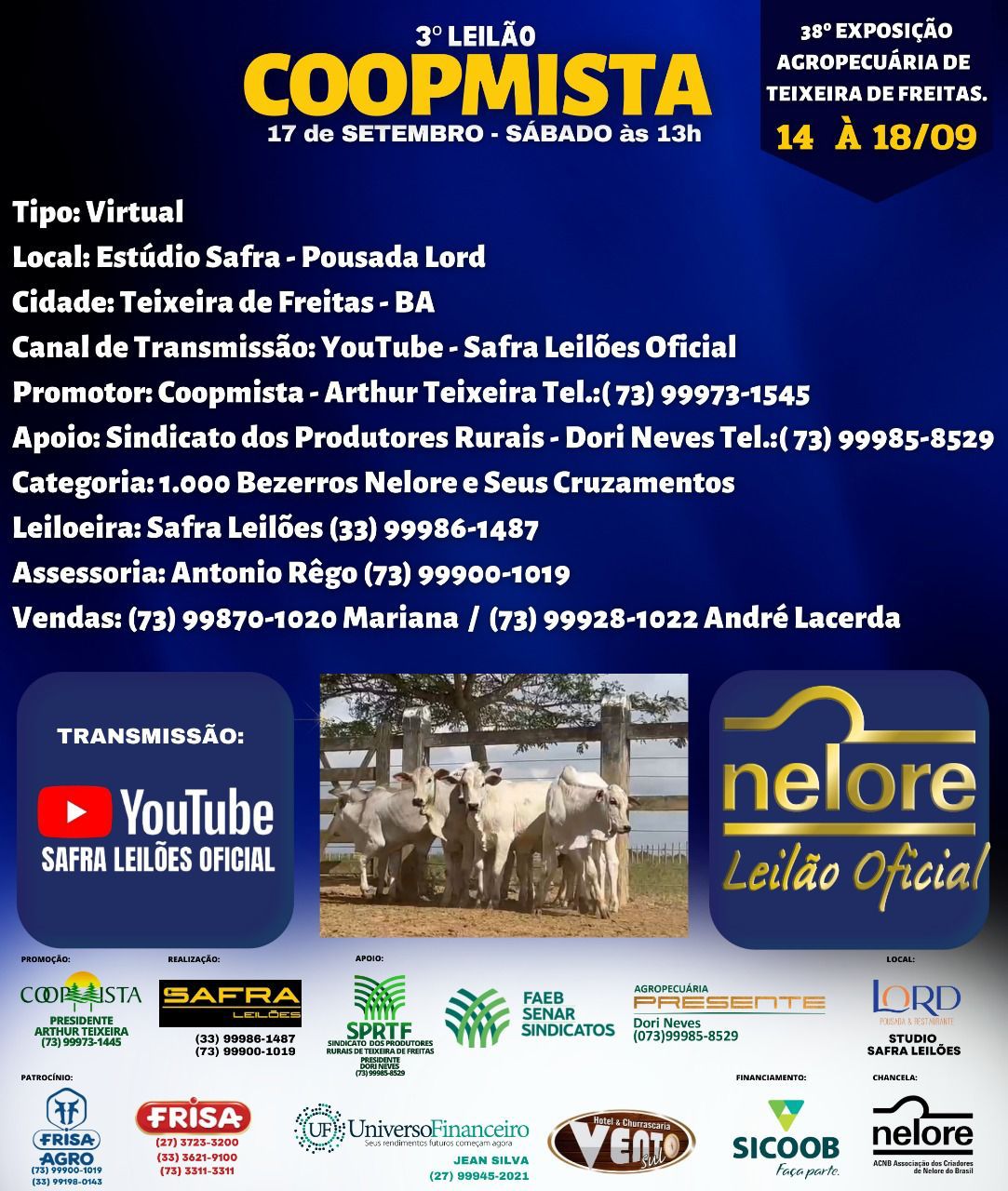 No dia 17 de setembro, a partir das 13 horas, acontece o 3º Leilão Virtual Coopmista, na Pousada Lord, em Teixeira de Freitas (BA), com oferta de 1.000 bezerros Nelore e outros frutos de cruzamento industrial. Promovido pela Cooperativa Mista de Teixeira de Freitas (Coopmista), o evento acontece durante a 38ª Exposição Agropecuária de Teixeira de Freitas.