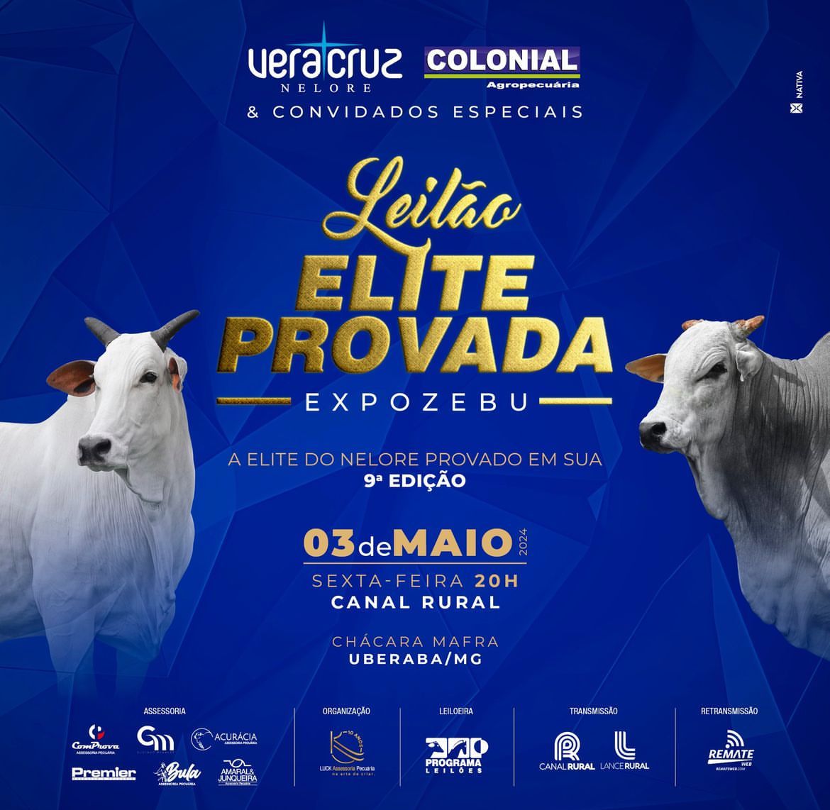 A 9ª edição do Leilão Elite Provada será promovida pela Nelore Vera Cruz e Colonial Agropecuária. O evento ofertará 32 lotes de fêmeas Nelore Puros de Origem (PO) selecionados. O leilão acontece na sexta-feira, dia 03 de maio, às 20 horas (horário de Brasília) na Chácara Nelore Mafra em Uberaba (MG), durante a Expozebu 2024.