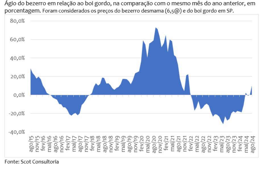 Um ágio elevado indica que o preço do bezerro está se mantendo firme ou até mesmo subindo, em comparação com o boi gordo. Isso geralmente reflete uma oferta reduzida de bezerros no mercado, o que pode estar relacionado a uma menor quantidade de fêmeas indo para o abate. Quando há menos fêmeas sendo abatidas, a produção de bezerros diminui, o que leva a uma oferta restrita e, consequentemente, a preços mais altos para os bezerros.