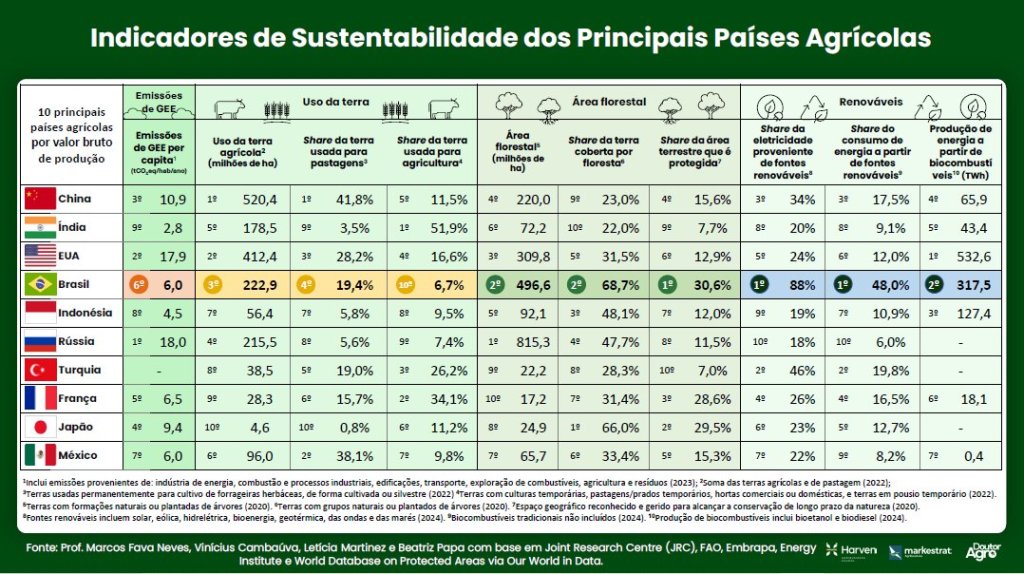 Esses contrastes mostram que sustentabilidade na agricultura não depende apenas de tamanho territorial ou volume produzido. Políticas públicas, inovação tecnológica e gestão eficiente são determinantes.