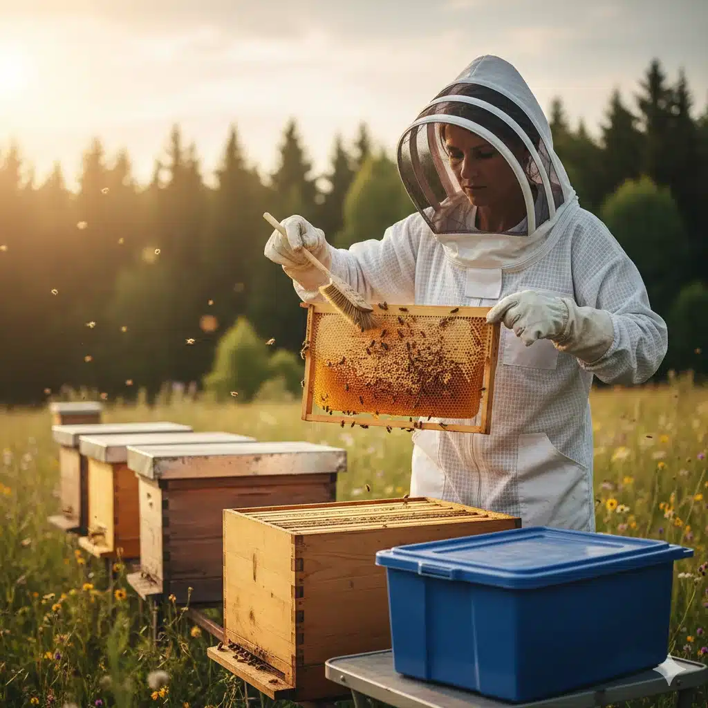 Ao realizar a escovação de cima para baixo, as abelhas retornam naturalmente para a caixa. É fundamental realizar esse procedimento sobre a colmeia aberta para que as operárias não se percam ou fiquem desorientadas. Assim que o quadro estiver limpo, ele deve ser colocado imediatamente em uma caixa de transporte fechada. Esse rigor no manejo é o que separa o amador do profissional na apicultura para iniciantes, garantindo que a sala de extração permaneça um ambiente controlado e higiênico.