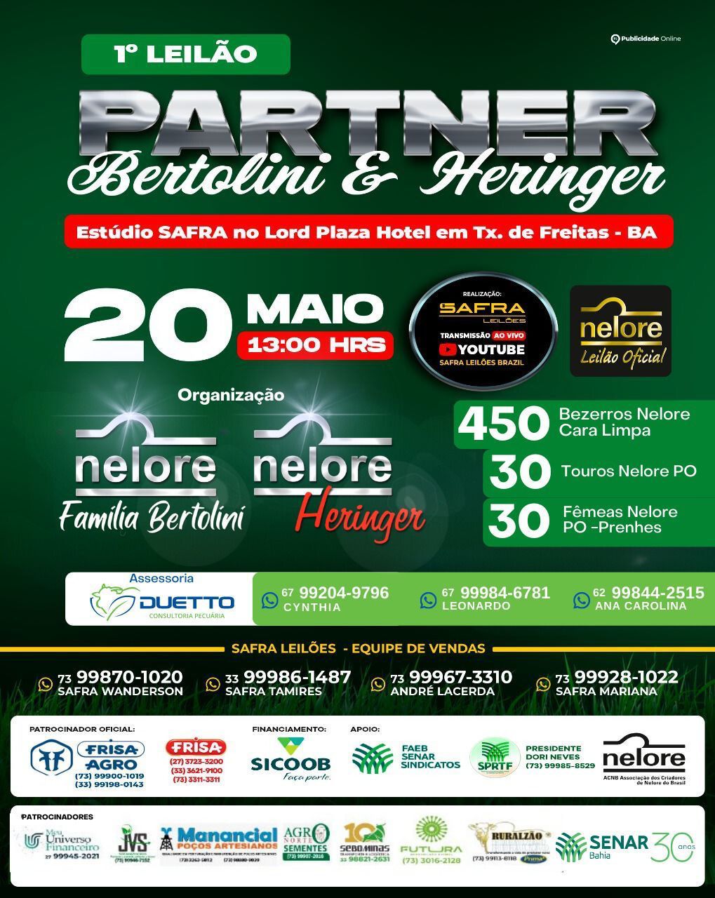 O primeiro Leilão Projeto Partners, parceria entre os criatórios Bertolini e Nelore Heringer, ofertará 700 animais Nelore, sendo 30 touros e matrizes PO, além de 640 bezerros da mais alta qualidade genética. O evento acontecerá de forma virtual no dia 20 de maio, a partir das 13 horas (horário de Brasília), com o apoio do Sindicato dos Produtores Rurais de Teixeira de Freitas (BA).