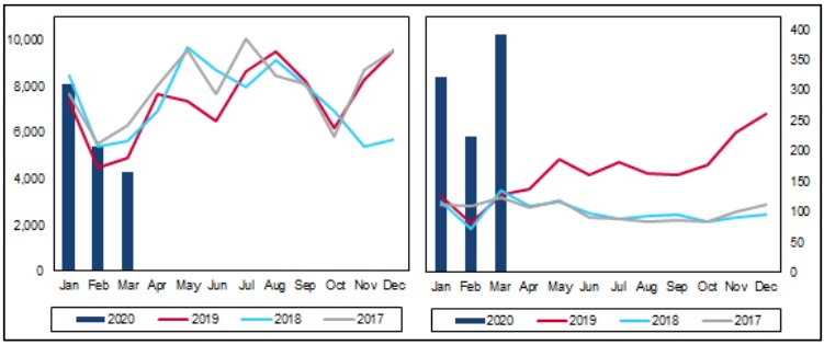 - Contrôle da endemia da PSA: A China registrou vários casos de PSA, em 2020, com um número crescente nas últimas semanas. O aumento é notável, pois segue ao levantamento do lockdown no país e retorno ao fluxo controlado de animais, produtos e pessoas, após o bloqueio. Para evitar a propagação da doença, o governo voltou a enfatizar o gerenciamento do transporte de suínos vivos das regiões afetadas, exigindo inspeções rigorosas tanto na venda quanto no recebimento. Embora a política seja importante para ajudar a retardar a propagação da doença, também pode aumentar as preocupações de alguns produtores que sofreram perdas devido à proibição do transporte de suínos vivos no ano passado. Os pequenos produtores tendem a abondonar a indústria em 2020, já que os preços dos animais estão em níveis recordes, impulsionados por uma oferta muito reduzida. Isso ocorre no momento em que as propriedades familiares já estão em dívida e o acesso ao financiamento é mais escasso em meio à desaceleração da economia. Com os negócios voltando ao normal em todo o país, a demanda está se recuperando lentamente. Em abril, o governo chinês continuou a liberar reservas de carne suína congelada, buscando conter, ou atenuar, aumento de preços (Figura 8) (RaboResearch, Food & Agribusiness, 2020)1,5 e (Fitch Solutions, 2020)1,3.
