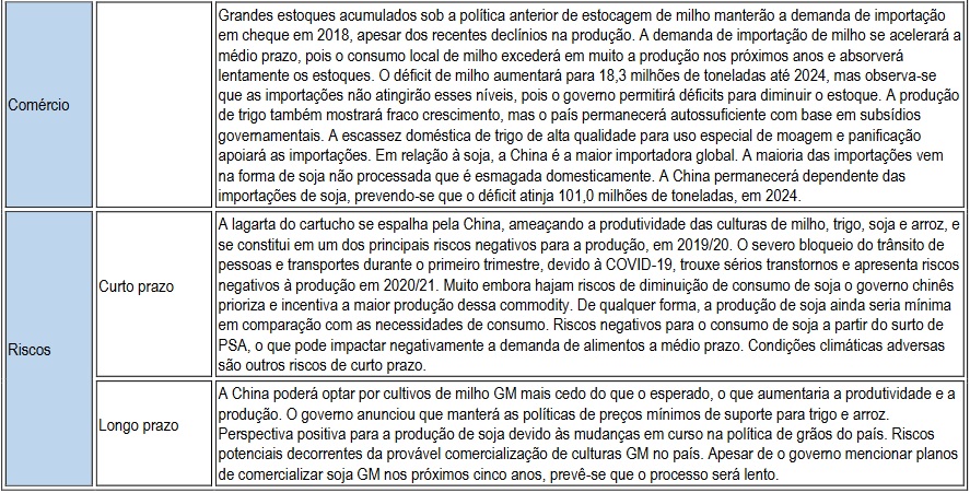 - Dificuldades na implementação do acordado com os EUA. Após dois anos de uma guerra comercial, que levou à imposição de tarifas de importação de produtos agrícolas dos EUA, por parte da China, e a mudanças incessantes nas perspectivas comerciais, os dois países assinaram a Fase-Um de um novo Acordo, em janeiro de 2020. A China se comprometeu a adquirir US$ 12,5 bilhões adicionais, em produtos agrícolas, em 2020, e US$19,5 bilhões adicionais, em 2021, em relação a 2017. Em março, os EUA anunciaram que a China havia se comprometido a comprar 817.000 toneladas de milho e 252.000 toneladas de trigo. Se realizados, os volumes de vendas excederiam as exportações de milho havidas para a China, em anos anteriores. Apesar deste anúncio, acredita-se que será difícil corresponder a essas promessas, especialmente em 2021. Em 2020, embora as necessidades de importação agrícola da China sejam fortes, os reflexos da pandemia da COVID-19 provavelmente criarão dificuldades ao estipulado no Acordo. É grande o desafio e com baixa possibilidade de progresso adicional nas negociações comerciais, observando-se que uma projetada Fase-Dois não será provável antes das eleições presidenciais e legislativas, nos EUA, previstas para novembro de 2020 (Fitch Solutions, 2020)1.