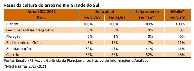 Na de Soledade, a colheita avançou pouco. O atraso deveu-se à ocorrência de chuvas, sobretudo na segunda metade do período. Com o tempo firme, a operação foi retomada e alcançou 15% da área cultivada. A produtividade obtida está à margem da esperada, porém, diferentemente das regiões mais a Oeste do Estado, a qualidade do grão é considerada adequada. Os níveis de água dos rios e arroios aumentaram com as chuvas, e a disponibilidade de água para as lavouras de arroz foi normalizada.