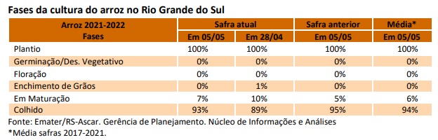 Nas regionais de Santa Maria, Pelotas e Soledade, a colheita foi interrompida na maior parte do período e evoluiu lentamente no restante, porém houve dificuldade de acesso de maquinas às lavouras e umidade elevada no produto. Nas duas últimas regiões, o rendimento de engenho e a produtividade são considerados adequados.
