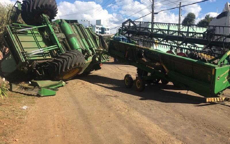 Colheitadeira sem freio desce avenida em alta velocidade e capota em Santa Catarina.