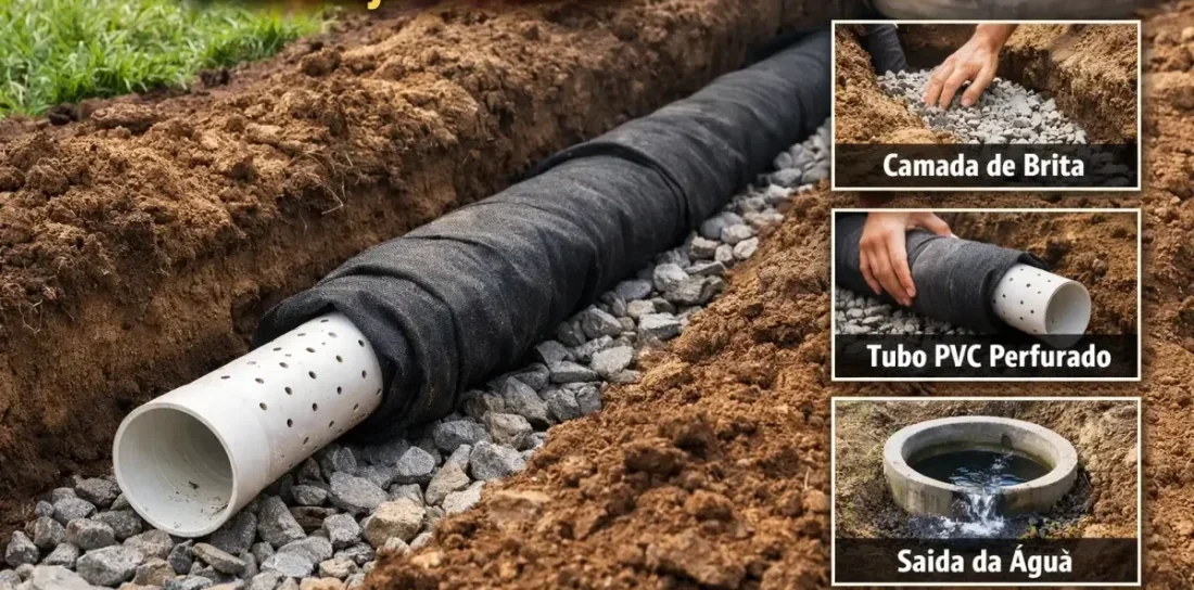 Após abrir a vala, adiciona-se uma camada de brita no fundo. Esse material atua como filtro e facilita a passagem da água até o tubo. Em seguida, posiciona-se o cano, que pode ser perfurado manualmente com pequenos furos distribuídos ao longo da base.