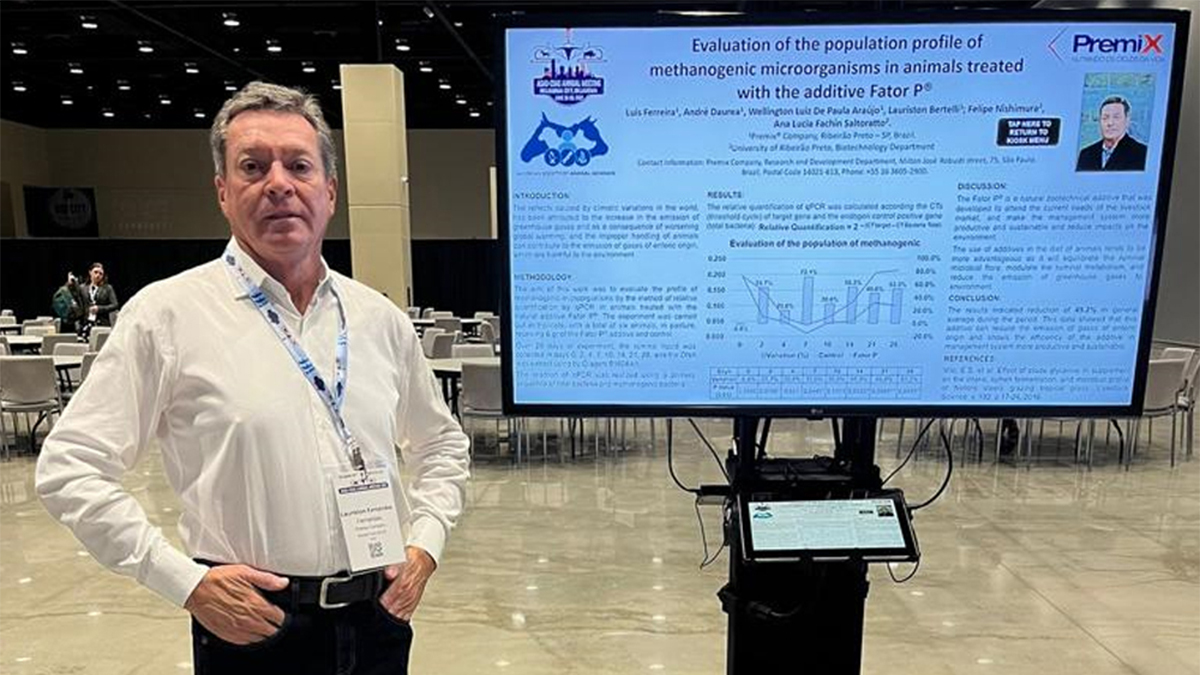 Neste ano, a participação da empresa é presencial, através do estudo com o título “Avaliação do perfil da população de microrganismos metanogênicos em animais tratados com o aditivo Fator P”, apresentado pelo diretor de Pesquisa, Desenvolvimento e Inovação, Lauriston Bertelli.