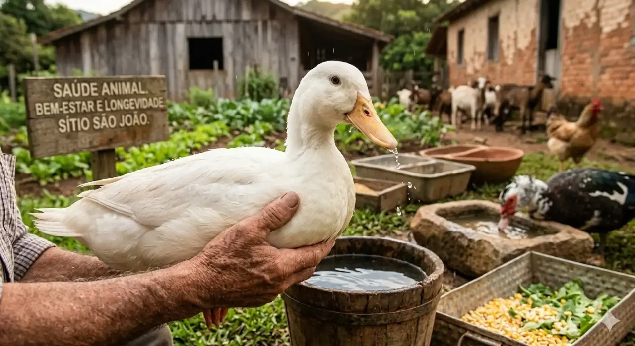 Além da comida, a qualidade da água é inegociável. Patos são aves aquáticas por natureza e utilizam a água não apenas para beber, mas para limpar as narinas e os olhos. Água estagnada ou contaminada é o veículo perfeito para botulismo e cólera aviária, doenças que podem dizimar uma criação em poucos dias. Manter tanques e bebedouros limpos é uma estratégia simples que protege o investimento do produtor.