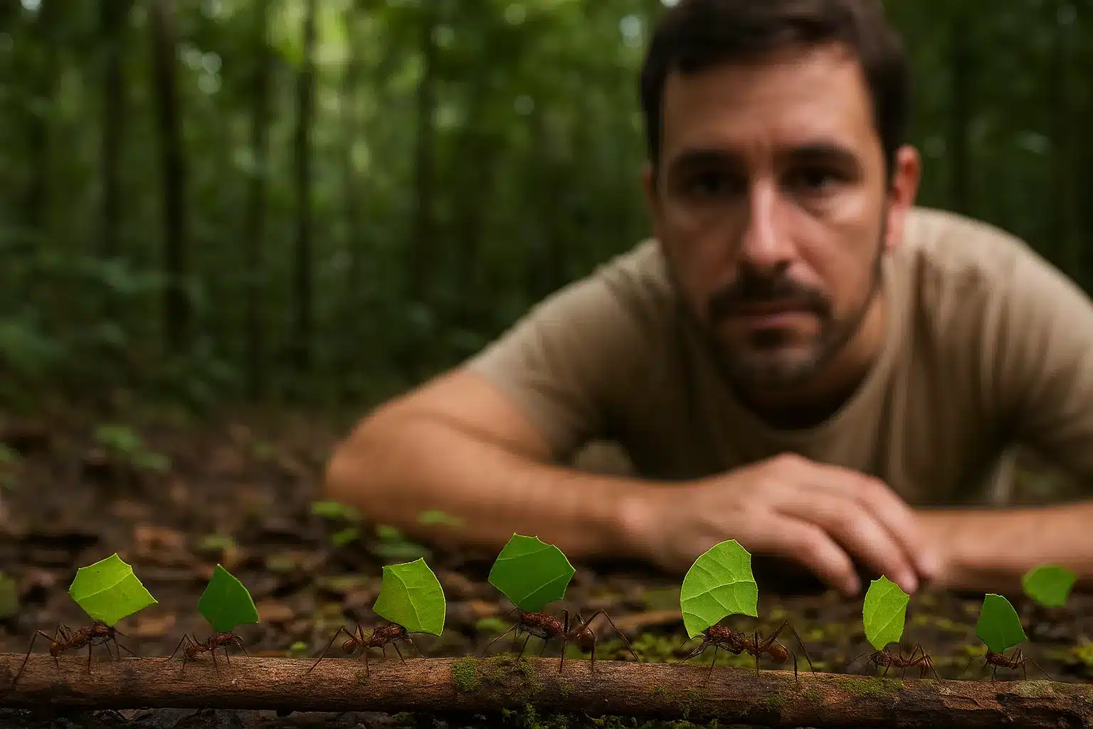 Pouca gente sabe que as formigas cortadeiras não comem diretamente as folhas que recolhem. Elas as levam para dentro do formigueiro para cultivar um fungo específico, que sim, é o alimento delas. Esse fungo, por sua vez, também interage quimicamente com a colônia.