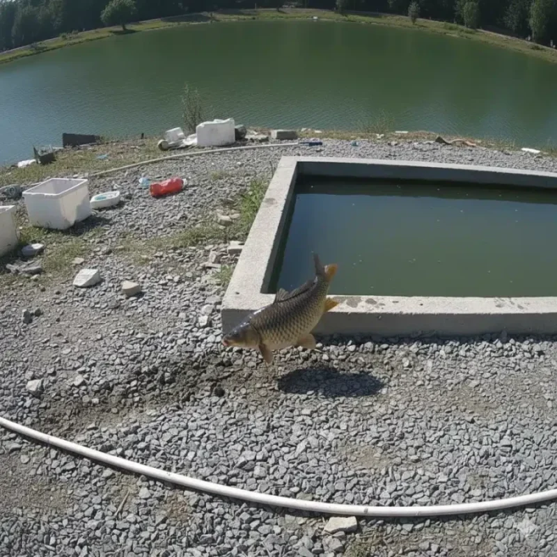 O cenário é, provavelmente, uma fazenda de aquicultura. A água do tanque é turva, as paredes são baixas e o ambiente ao redor está desordenado, coberto de lixo e detritos. Essa paisagem sugere condições de cativeiro aquém do ideal. O peixe, possivelmente uma carpa ou espécie robusta comum em sistemas de cultivo, demonstra uma agitação crescente antes do ato. Ele não salta por acaso; o movimento é o culminar de uma avaliação instintiva de risco.