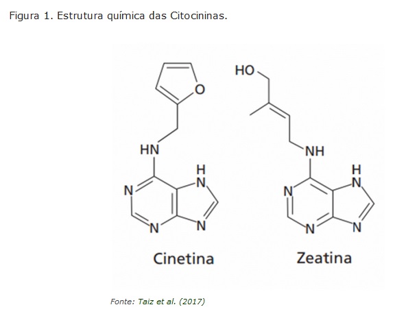 As citocininas são uns dos principais hormônios envolvidos em processos bioquímicos e metabólicos da planta, conforme destacado por Taiz et al. (2017), a Cinetina é uma das principais citocininas sintéticas similares a de ocorrência natural.