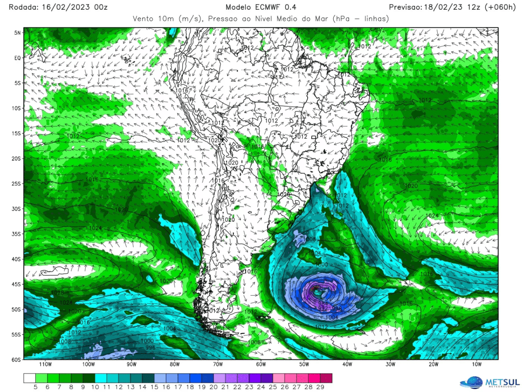 Não há indicativo de vento ciclônico, que é intenso e com rajadas por muitas horas seguidas, o que se espera na área mais próxima do sistema, no litoral do Uruguai e na costa de Buenos Aires. No litoral, contudo, o tempo fica mais ventoso no final desta semana com o vento apresentando rajadas em média de 50 km/h e 70 km/h – isoladamente maiores – em alguns momentos no Sul e no Leste gaúcho e nos litorais catarinense, paranaense e da costa Sul de São Paulo.