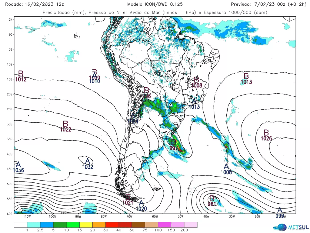 O modelo meteorológico alemão Icon, um dos mais confiáveis e usados no mundo, indica que será uma bomba meteorológica no Atlântico Sul. Tal modelo indica pressão mínima no centro da baixa pressão de 997 hPa para 21h desta quinta-feira na costa do Uruguai e de 971 hPa no mesmo horário na sexta, quando o sistema já estará distante. A queda em 24 horas é de 26 hPa, o que classifica o sistema como bomba.