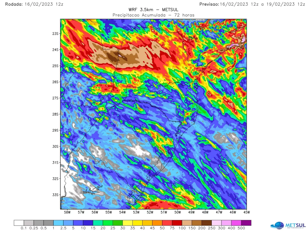 Os volumes de chuva devem ser muito altos a excessivos com elevada probabilidade tanto de inundações como de alagamentos no Paraná. Acumulados superiores a 150 mm ou 200 mm podem se dar em diversas cidades paranaenses, como mostra a projeção de chuva acumulada em 72 horas, até 9h de domingo, do nosso modelo WRF.