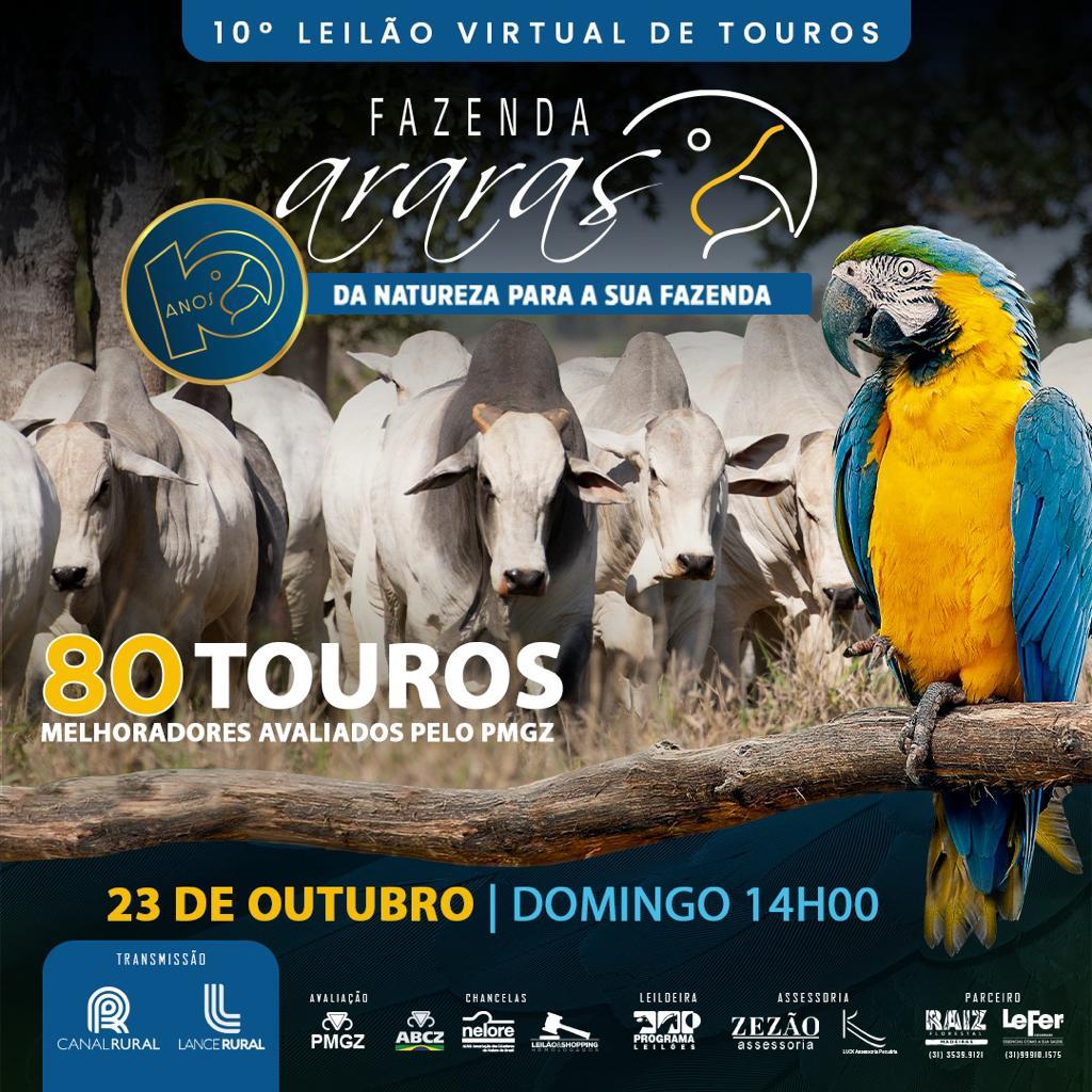 A Fazenda Araras prepara-se para a realização das ofertas de 80 reprodutores Nelore, no dia 23 de outubro, a partir das 14 horas (horário de Brasília), durante o 10º Leilão Virtual de Touros. Todos os machos selecionados pelo criatório possuem avaliação do Programa de Melhoramento Genético de Zebuínos (PMGZ), da Associação Brasileira dos Criadores de Zebu (ABCZ).