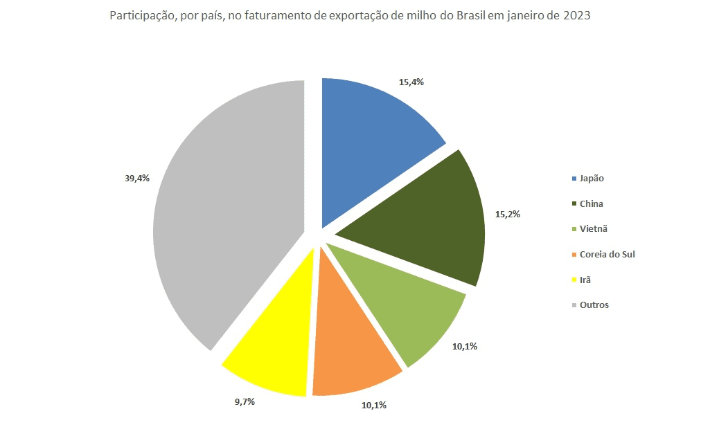 O fato é que em janeiro de 2023, Japão e China participaram com, respectivamente, 15,4% e 15,2% de toda a receita gerada pelo mercado de exportação de milho do Brasil. Complementando a lista dos maiores importadores, o Vietnã, Coreia do Sul e Irã apresentaram importância, no faturamento de, 10,1%, 10,1% e 9,7%, nessa ordem (Figura).