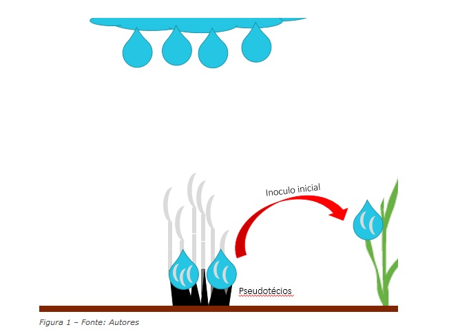 Na ausência de culturas hospedeiras, a Drechslera tritici-repentis sobrevive no solo através de estruturas especializadas, os pseudotécios. Em condições de temperaturas favoráveis, eles produzem ascósporos que são liberados atingindo as folhas das plântulas de trigo, dando início ao ciclo primário da doença (Figura 1). Além disso, as sementes são a principal fonte de introdução em novas áreas, e os resíduos culturais são a principal fonte de manutenção do patógeno na falta de um hospedeiro vivo (HOSFORD, 1971; KRUPINSKY, 1982).