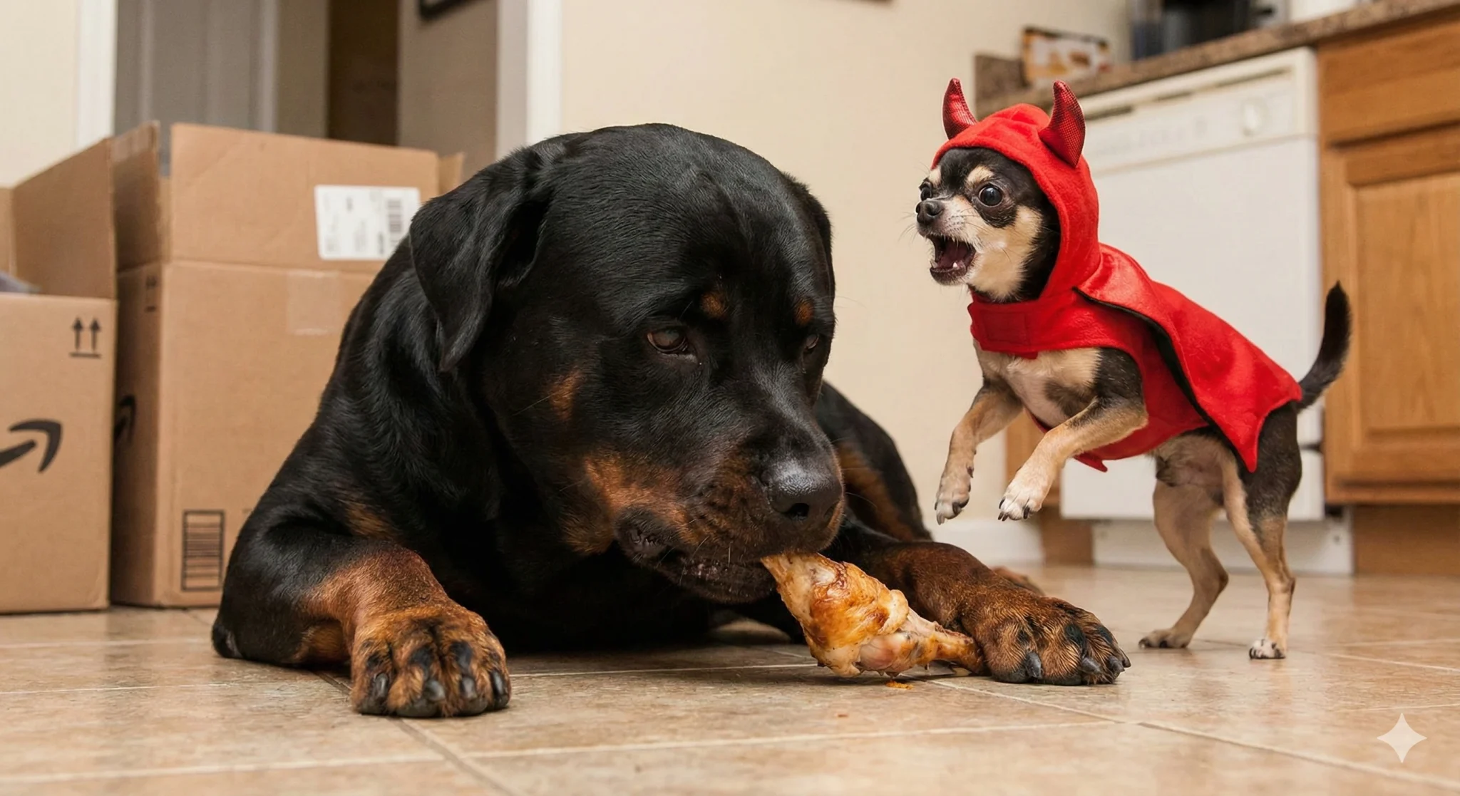 Em um cenário digital onde o caos parece reinar supremo e as notificações disputam nossa atenção como fogos de artifício, surge um conteúdo que captura a essência da verdadeira maturidade. Recentemente, um vídeo postado na plataforma X viralizou, acumulando milhões de visualizações. A cena é simples, mas carrega uma profundidade filosófica: um imponente Rottweiler negro, com pelagem lustrosa e olhar sereno, delicia-se calmamente com uma coxa de frango. Ao seu lado, um Chihuahua minúsculo, vestido com uma fantasia de demônio vermelho, late freneticamente, tentando roubar a cena.