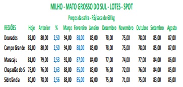 MERCADO: Apesar da nova alta de hoje, no geral o produtor está bem capitalizado, prefere não vender. Por outro lado, as indicações voltaram a subir mais R$ 2/saca em Dourados e Campo Grande para R$ 82,00; R$ 2,00 em Maracaju para R$ 81,00; R$ 2,00 em Sidrolândia para R$ 80,00; R$ 2/saca em Chapadão do Sul para R$ 78,00.