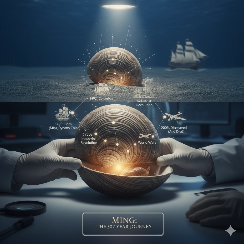 Inicialmente, estimou-se que o animal tinha pouco mais de 400 anos. Contudo, revisões posteriores em 2013, utilizando métodos de datação por radiocarbono, confirmaram que ele tinha exatamente 507 anos. O nome Ming foi escolhido em referência à dinastia chinesa que governava quando ele nasceu, em 1499. É fascinante pensar que, enquanto o Brasil era descoberto pelos europeus, o Molusco Ming já iniciava sua jornada no leito oceânico, alheio aos conflitos e revoluções que moldariam a civilização moderna.