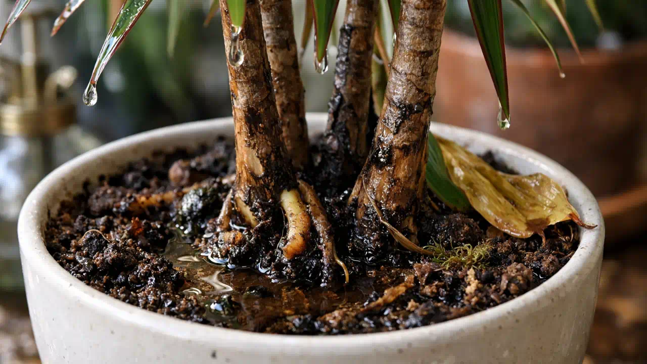 Na Dracena-marginata, esse ambiente favorece fungos que atacam diretamente as raízes finas, essenciais para a absorção de água e nutrientes.