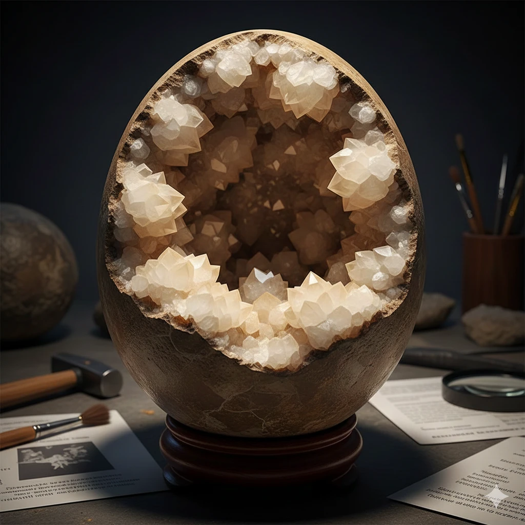 O processo que transformou este material em uma geode natural é fascinante. Após o soterramento, a matéria orgânica desapareceu, deixando uma cavidade oca. Com o passar do tempo, fluidos ricos em minerais penetraram pelos poros microscópicos da casca. A calcita, presente na água que circulava pelo solo da Bacia de Qianshan, começou a se depositar nas paredes internas. Esse ciclo de infiltração e precipitação mineral deu origem aos cristais que vemos hoje ao abrir o ovo de dinossauro fossilizado.