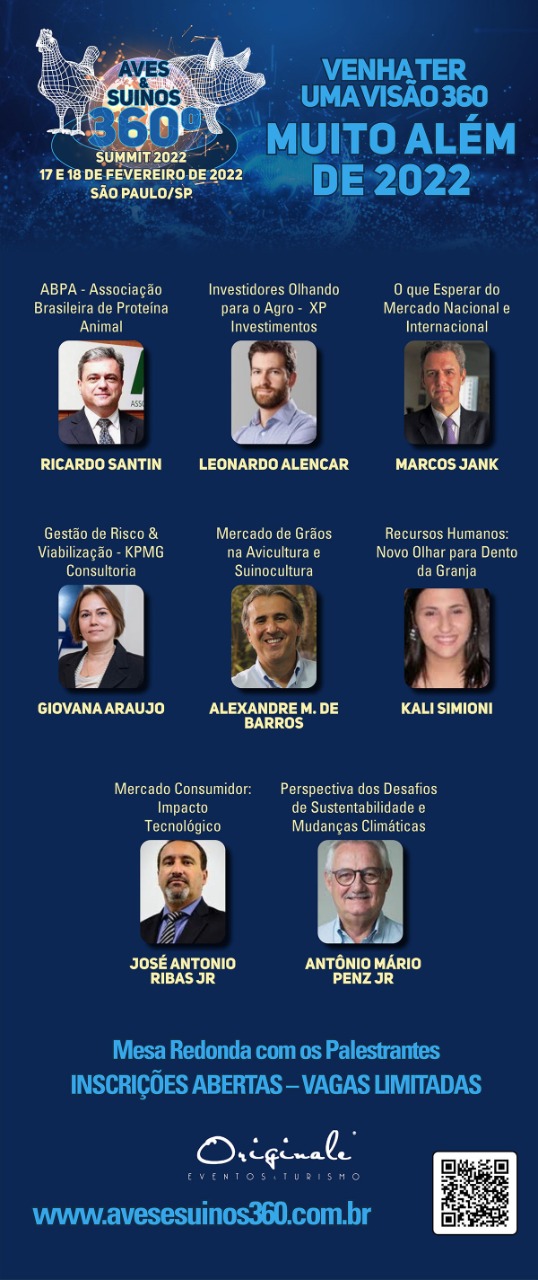 O evento Aves & Suínos 360º – Summit 2022, que será realizado nos dias 17 e 18 de fevereiro de 2022, no Hotel Pullman Vila Olímpia, em São Paulo (SP), contará com um time de palestrantes que abordará temas como as novas tecnologias na produção e comercialização, visão de investimentos e perfil do consumidor com o objetivo de unir os mercados de avicultura e suinocultura por meio do network. A conferência será 100% presencial.