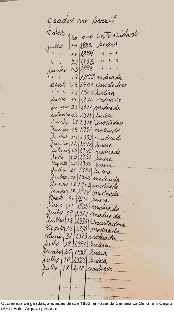 As geadas deste ano não têm nenhuma relação com o desmatamento. Nem é preciso recorrer a dados climáticos centenários da meteorologia nacional para atestar sua “normalidade”. Basta observar a ocorrência de geadas, anotadas desde 1882 na Fazenda Santana da Serra, em Cajuru (SP). Foram muitas e de diversas intensidades, em quase um século e meio.