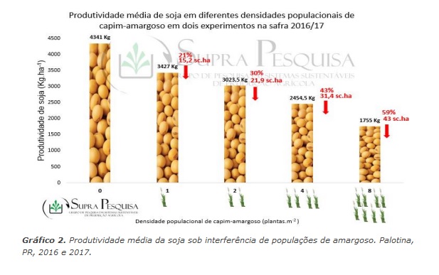 As produtividades de soja foram de 4.341 kg/ha, 3.427 kg/ha, 3.023 kg/ha, 2.454 kg/ha e 1755 kg/ha, na presença de 0, 1, 2, 4 e 8 planta m² de capim-amargoso. Ou seja, uma touceira de amargoso por m² leva 1/5 da produtividade embora!