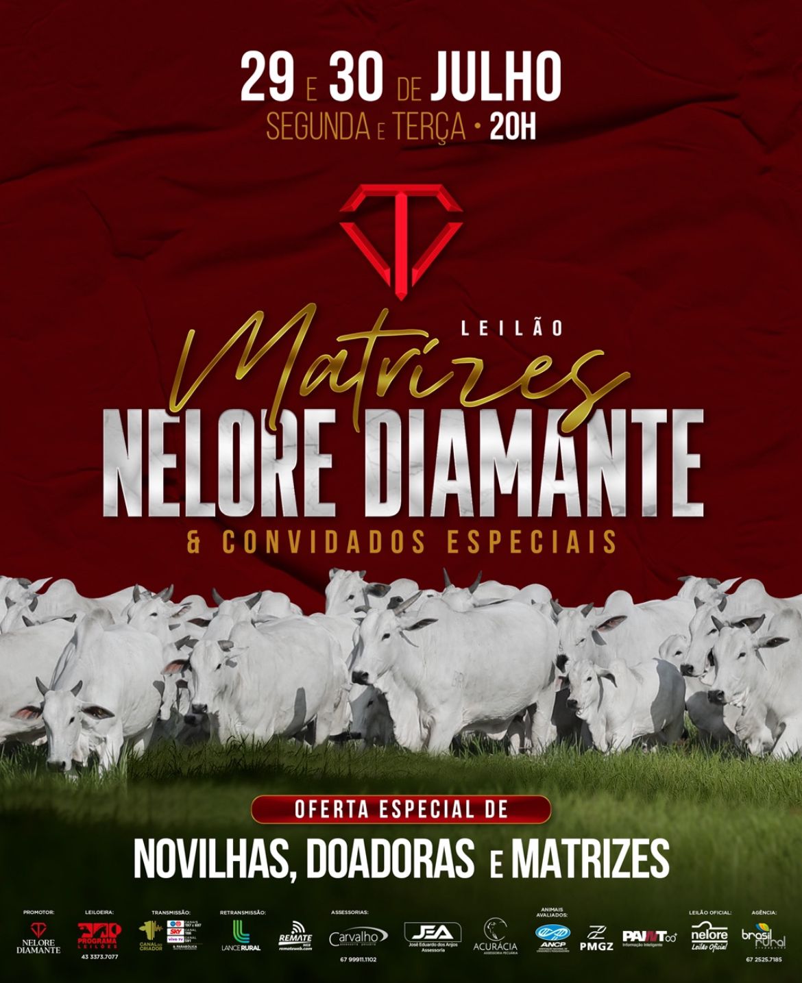O Leilão Virtual Nelore Diamante e Convidados acontece nos dias 29 e 30 de julho, com a oferta de 100 animais Nelore, a partir das 20 horas (horário de Brasília), em formato virtual. O leilão terá matrizes cuidadosamente selecionadas, que possuem alta qualidade genética.