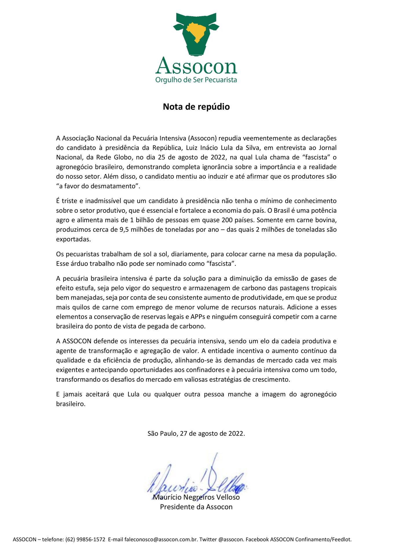 A Associação Nacional da Pecuária Intensiva (Assocon) repudia veementemente as declarações do candidato à presidência da República, Luiz Inácio Lula da Silva, em entrevista ao Jornal Nacional, da Rede Globo, no dia 25 de agosto de 2022, na qual Lula chama de “fascista” o agronegócio brasileiro, demonstrando completa ignorância sobre a importância e a realidade do nosso setor. Além disso, o candidato mentiu ao induzir e até afirmar que os produtores são “a favor do desmatamento”.
