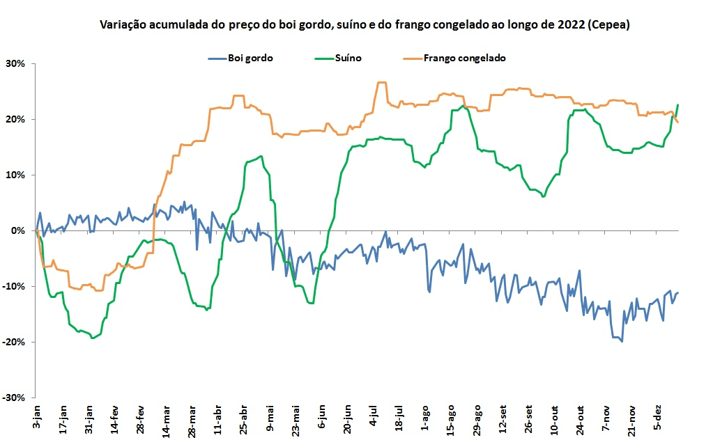 Variação do preço do boi gordo, suíno e frango ao longo de 2022.