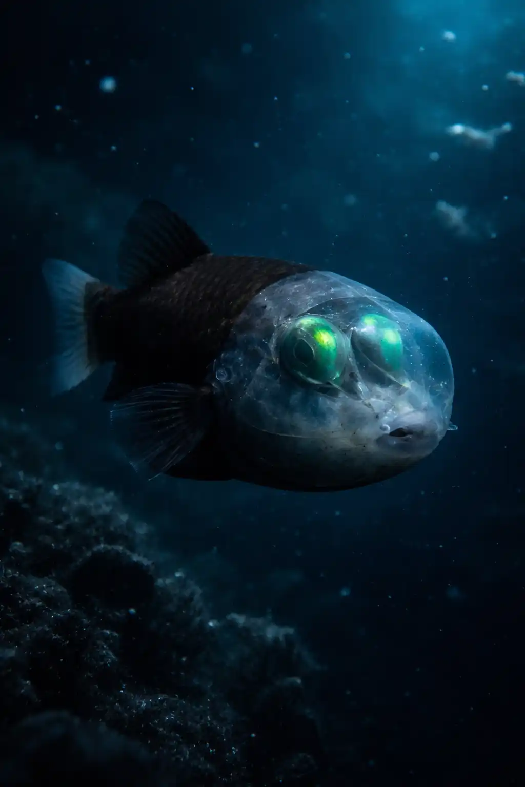 Os olhos, que inicialmente parecem estar na frente do rosto, na verdade ficam dentro da cabeça, protegidos por essa estrutura translúcida. Essa transparência reduz reflexos e melhora a capacidade de detectar movimentos acima do animal, algo essencial em um ambiente escuro.