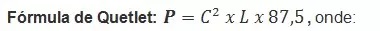 P = peso vivo (kg); C = Perímetro Torácico, atrás da espádua (m); L = comprimento do corpo da ponta da espádua à ponta da nádega (m); 87,5 = coeficiente.