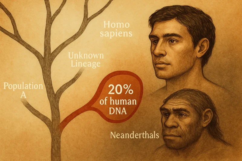 Um estudo recente revelou que 20% do DNA humano pode ter origem em uma linhagem genética misteriosa, chamada População B. Essa população se separou da linhagem principal que deu origem aos Homo sapiens e neandertais há 1,5 milhão de anos, e só se reencontrou com ela 300 mil anos atrás. Essa descoberta pode mudar a forma como compreendemos a evolução humana e nossa capacidade cognitiva.