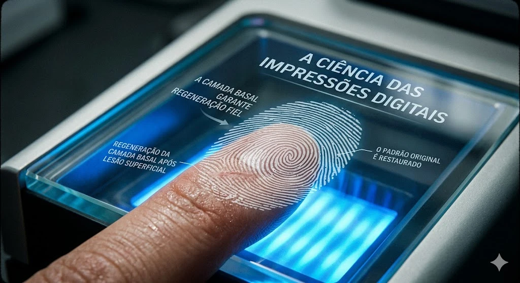 As impressões digitais são marcas biológicas formadas na camada basal da pele, tornando sua remoção permanente praticamente impossível. Mesmo após queimaduras ou abrasões superficiais, o corpo regenera o padrão original em poucas semanas. Essa característica única garante a eficácia da biometria e da identificação forense em todo o mundo.