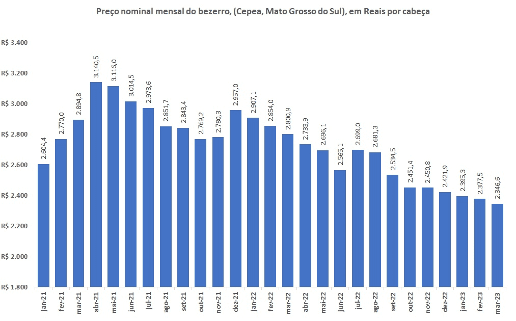 O preço do bezerro (Cepea, Mato Grosso do Sul), alcançou, na parcial de março de 2023, o oitavo mês consecutivo de queda (primeira Figura), com o valor médio de R$2.346,6 por cabeça. O valor parcial de março, além do mais baixo da série apresentada iniciada em 2021, foi o menor preço nominal desde outubro de 2020 (R$2.305,9).