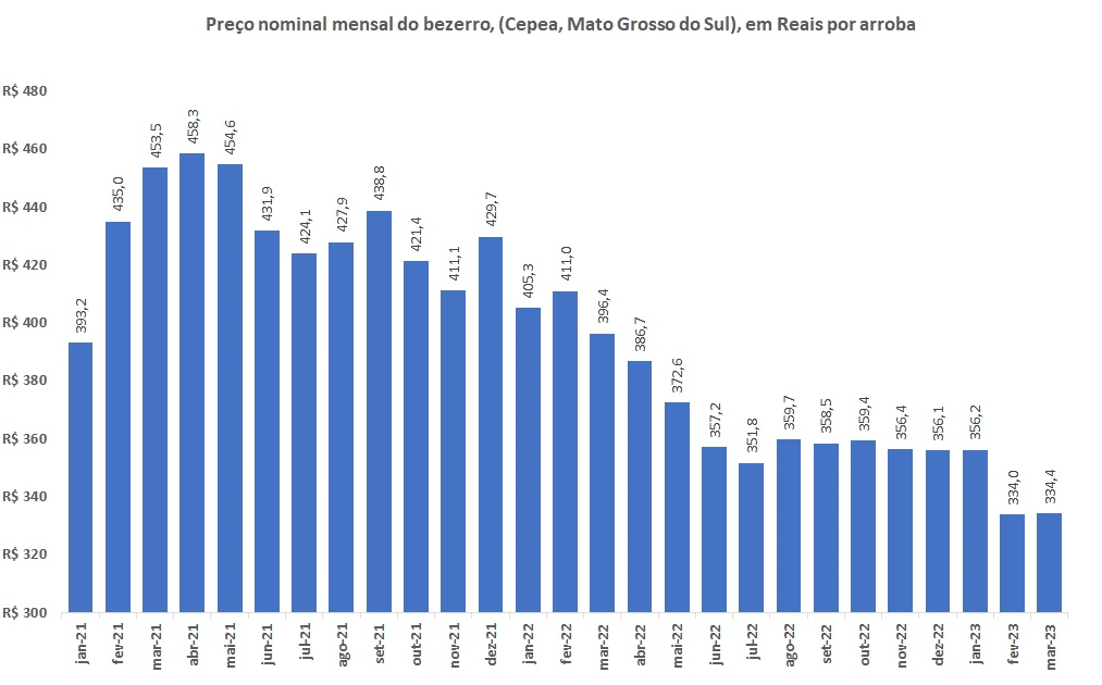 O preço do bezerro (Cepea, Mato Grosso do Sul) de R$334,4 por arroba na parcial de março de 2023 acumulou queda de 27,0% frente a máxima nominal de R$458,3 por arroba observada em abril de 2021.