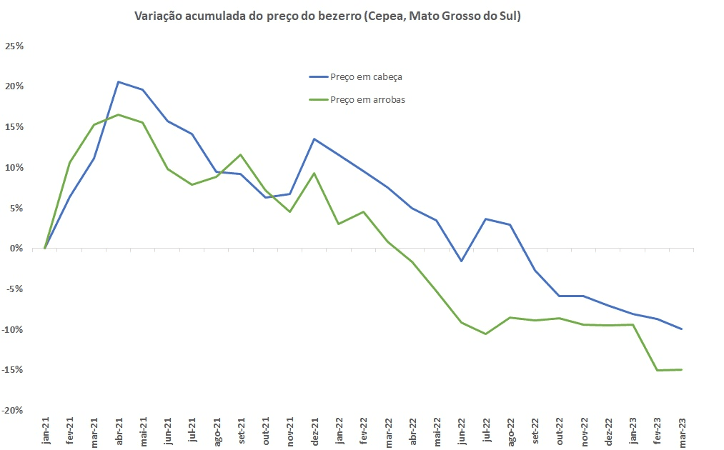 Entre janeiro de 2021 e a parcial de março de 2023 o preço do bezerro (Cepea, Mato Grosso do Sul) avaliado em Reais por cabeça caiu 9,9%, enquanto em Reais por arroba a perda foi maior, de 15,0% em razão do aumento do peso médio de venda. Vale lembrar que entre janeiro de 2021 e a parcial de março de 2023 o peso médio variou de 198,7kg e 210,5kg no período.