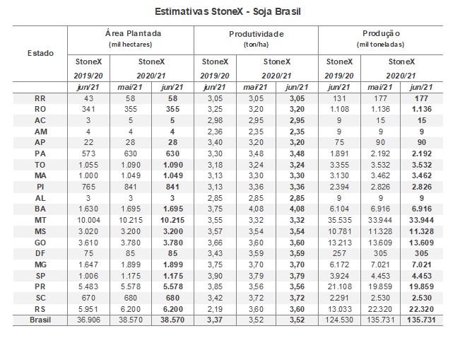 A produção brasileira de soja da safra 2020/21 deve ser consolidada em recorde de 135,7 milhões de toneladas, de acordo com revisão de junho da consultoria StoneX, que manteve seu número inalterado em relação ao mês anterior.