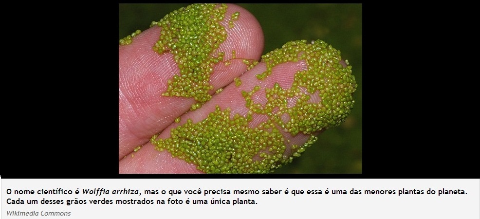 O nome científico é Wolffia arrhiza, mas o que você precisa mesmo saber é que essa é uma das menores plantas do planeta. Cada um desses grãos verdes mostrados na foto é uma única planta.