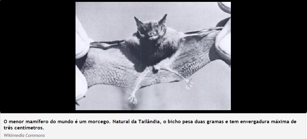O menor mamífero do mundo é um morcego. Natural da Tailândia, o bicho pesa dois gramas e tem envergadura máxima de três centímetros.