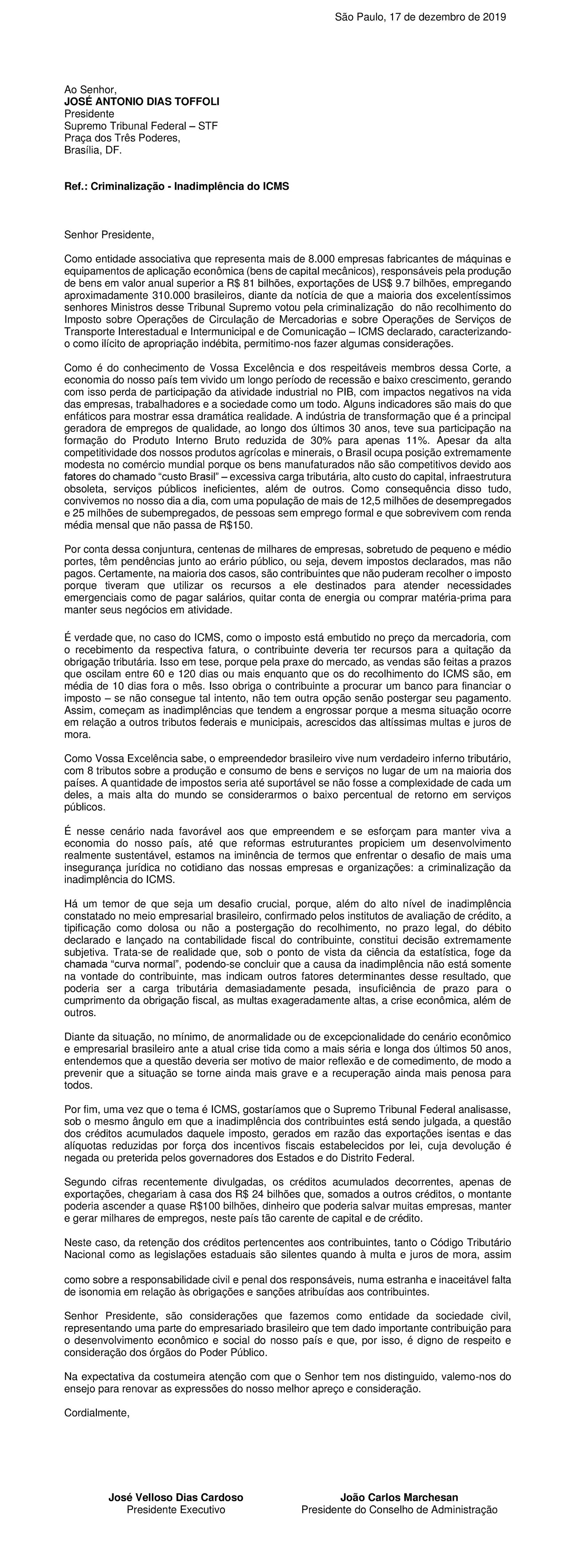 A um dia da sessão do Supremo Tribunal Federal (STF), que se reúne na próxima quarta-feira (18) para concluir nesta semana se o não recolhimento de ICMS regularmente declarado pelo contribuinte deve ser considerado crime de apropriação indébita, a ABIMAQ – Associação Brasileira da Indústria de Máquinas, através do seu presidente executivo, José Velloso e presidente do Conselho de Administração, João Carlos Marchesan, enviaram carta ao presidente do Supremo Tribunal Federal, Dias Toffoli.