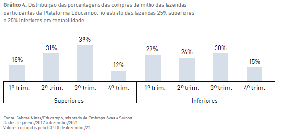 O relatório do Educampo/Sebrae MG destaca como a compra programada de insumos (Gráfico 4), alinhada à sua disponibilidade e preço, pode economizar recursos e garantir um suprimento constante necessário para a manutenção da produção. Propriedades com maior rentabilidade geralmente compram maiores volumes de milho nos trimestres de preços históricos mais baixos.