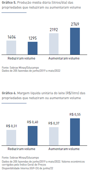 A elevação da produtividade, quando bem gerenciada, resulta na diluição dos custos na atividade leiteira. Essa otimização pode ser alcançada tanto pelo aumento do número de animais em lactação quanto pela elevação da produção individual por animal. Ambas as estratégias contribuem para a diluição dos custos fixos e variáveis, melhorando a margem líquida por unidade de produto para o produtor, conforme destacado pela Plataforma Educampo/Sebrae MG (2022). Os dados analisados (Gráficos 5 e 6) ressaltam a correlação positiva entre o aumento da produtividade e a melhoria da margem líquida.