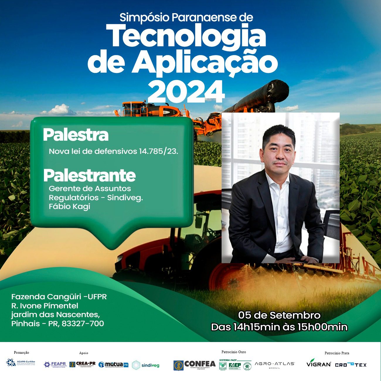 Para falar sobre a nova lei de defensivos agrícolas, o Sindicato Nacional da Indústria de Produtos para Defesa Vegetal (Sindiveg) confirma participação no Simpósio Paranaense de Tecnologia de Aplicação. O evento ocorrerá nos dias 05 e 06 de setembro, na cidade de Pinhais (PR).