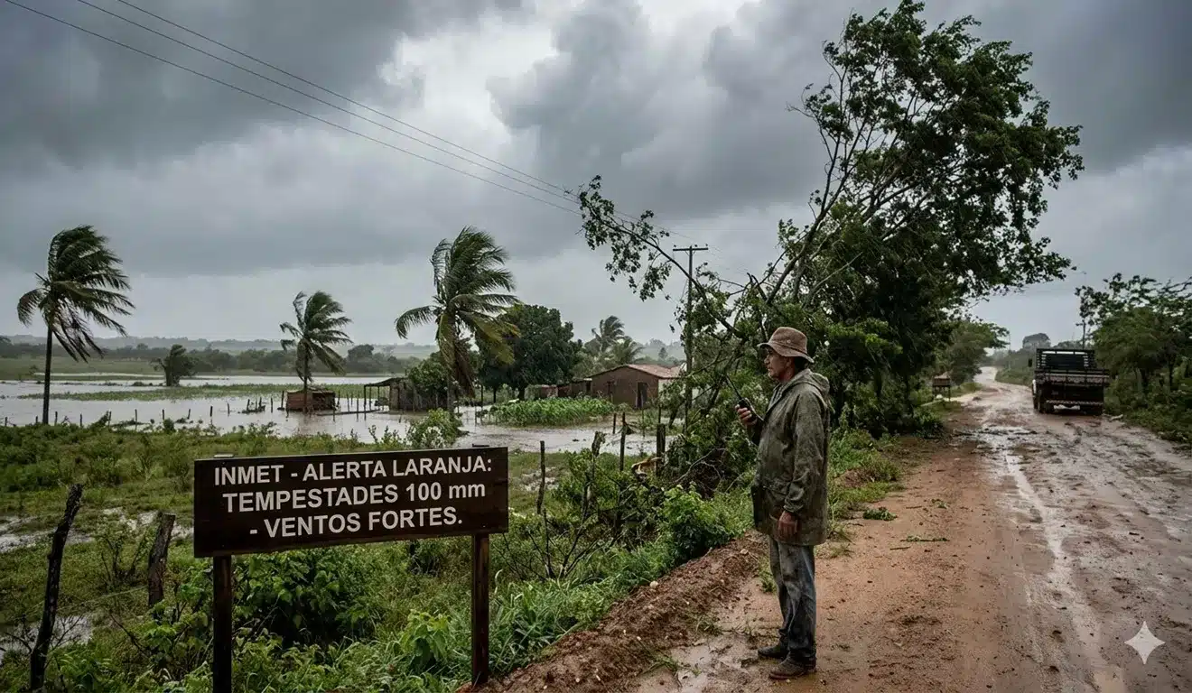 O Instituto Nacional de Meteorologia (Inmet) colocou 1.017 municípios do Norte e Nordeste sob alerta laranja nesta terça-feira (14). A previsão indica tempestades de 100 mm por dia e ventos intensos de até 100 km/h. O fenômeno traz riscos reais de alagamentos, queda de energia e danos a plantações. Estados como Maranhão, Piauí, Ceará, Amazonas e Pará estão na rota crítica do evento meteorológico extremo.