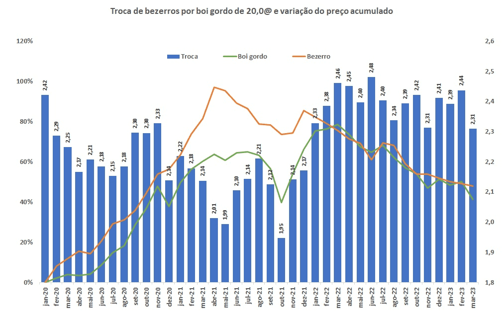 Em março de 2023 a relação de troca de bezerros por boi gordo de 20,0@ ficou em 2,31, abaixo do observado no mês anterior (2,44) e também em relação a março de 2022 (2,40).
